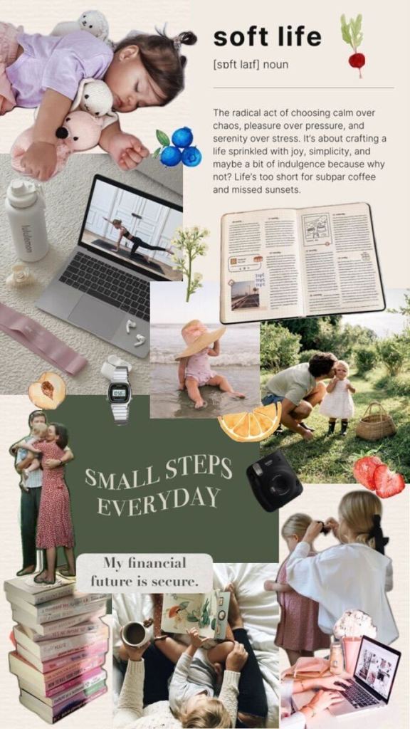 Em vez de definir metas rígidas com números pré-determinados, criei um vision board com imagens que me inspiram e representam o que desejo alcançar neste ano. As imagens podem não fazer sentido para vocês, mas para mim são uma maneira de visualizar um ano perfeito, com objetivos concretos, mas flexíveis.