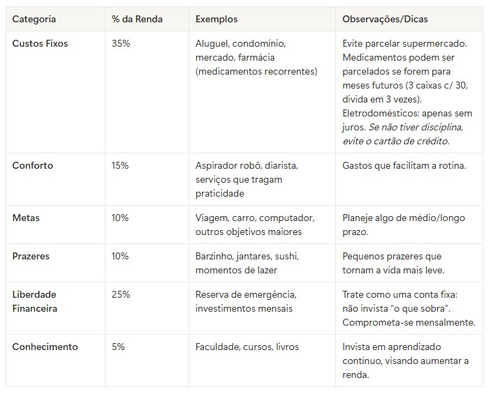 No meu caso, como mãe de família, mantenho os custos fixos em 35%. Mas, se fizer sentido para você, pode reduzir para 30%. Já a liberdade financeira deve permanecer entre 20% e 25%, pois é ela que garante tranquilidade no médio e longo prazo.